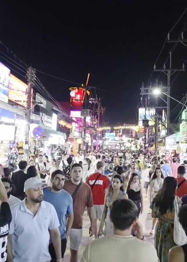 crowded street at night. There are many people walking in both directions, including men and women of varying ages, some holding drinks. The street is lined with shops and businesses, many illuminated with bright neon signs and lights. There are utility poles and overhead wires visible above the crowd. The overall impression is that it is a bustling and lively tourist area.