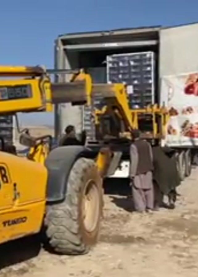 A yellow JCB forklift is being used to unload stacked crates from the back of a large, open-doored truck in a dusty, arid environment under a bright blue sky. Several men, dressed in traditional garb, are assisting with the unloading. In the background, there is a low wall and a few other vehicles. The side of the truck features a large advertisement showing an array of food items.
