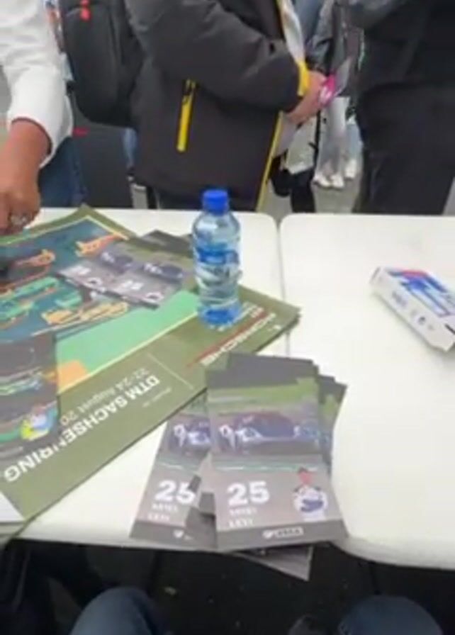crowd of people standing around a table covered with postcards of a race car driver, Ariel Levi. Some people are signing autographs on the postcards and other items that people hold out. A poster advertising a race event at the Sachsenring in Germany is visible. Some people are wearing jackets and hats, suggesting that the weather is cool or rainy.
