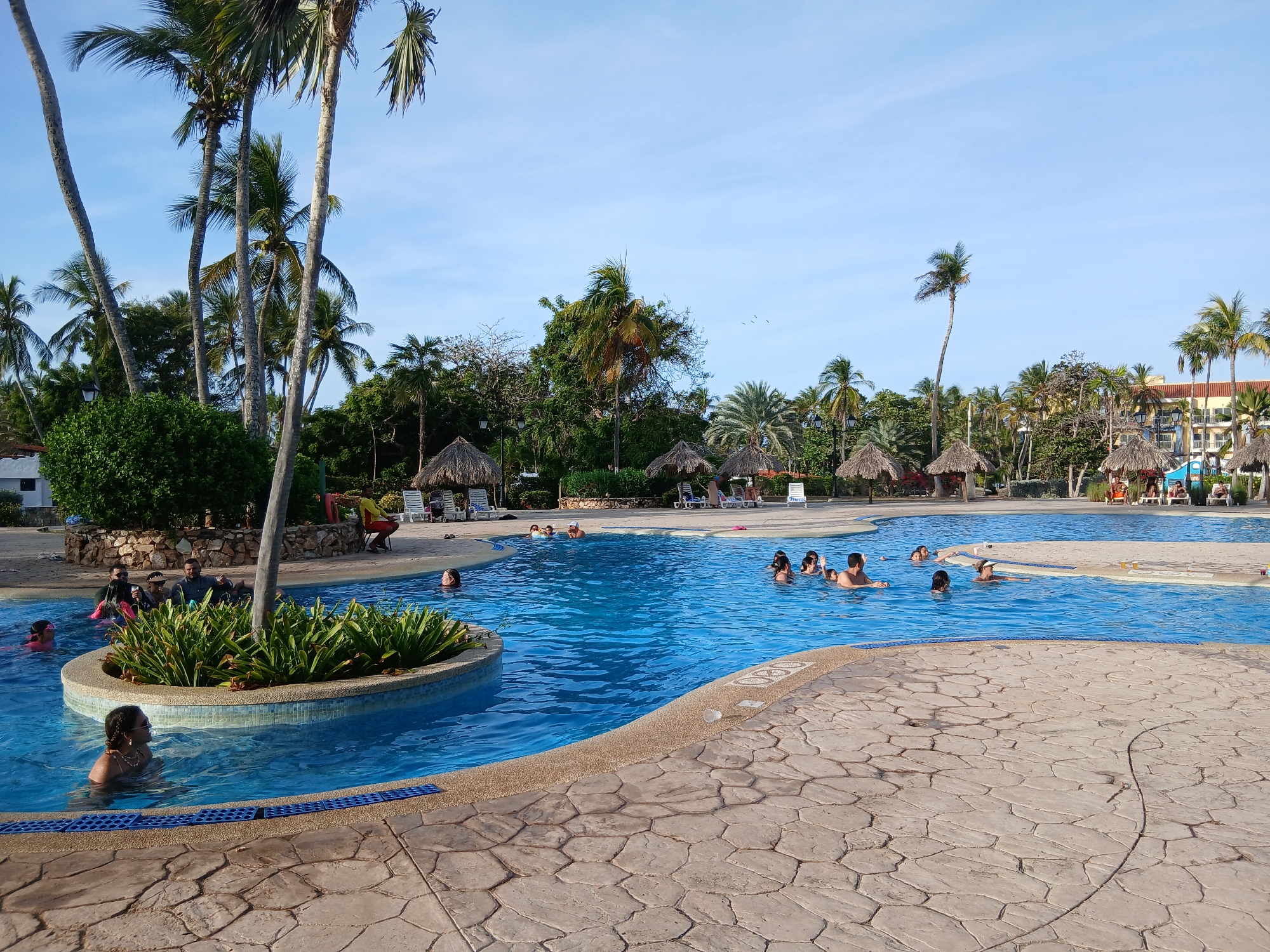 large, multi-section swimming pool at a resort in Playa El Agua, Venezuela. The pool is filled with clear blue water and surrounded by a textured, light-colored stone patio. Several people are in the pool, swimming, standing, and interacting. There is a small, circular island feature within the pool, adorned with plants. Palm trees of varying heights and thatched-roof sun shelters are visible around the pool area. In the background, lush green vegetation and a building with a light-colored facade and an orange roof can be seen. The sky is clear and blue, suggesting a sunny day.