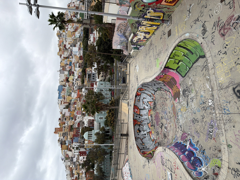 The image displays an urban landscape in Las Palmas de Gran Canaria, Spain. In the foreground, a concrete skatepark is visible, heavily adorned with multi-layered graffiti and tags across its bowls, ramps, and flat surfaces. No individuals are present within the skatepark. A set of concrete stairs and ramps with dark metal railings descends from the upper right, bordering the skatepark. Adjacent retaining walls are also covered in graffiti. A tall, dark grey street light pole with multiple lamp heads stands on the right side. In the midground, beyond the skatepark and stairs, several tall palm trees are interspersed among buildings. A prominent, light blue building with a dome roof is identifiable, likely the Gabinete Literario. Below this structure, a paved road with visible traffic lanes hosts a few red vehicles. The background features a densely built hillside entirely covered with numerous multi-story residential buildings. These structures exhibit a wide array of colors, including various shades of orange, yellow, blue, red, green, and white, creating a vibrant, patchwork appearance. The sky above is uniformly overcast with grey clouds.