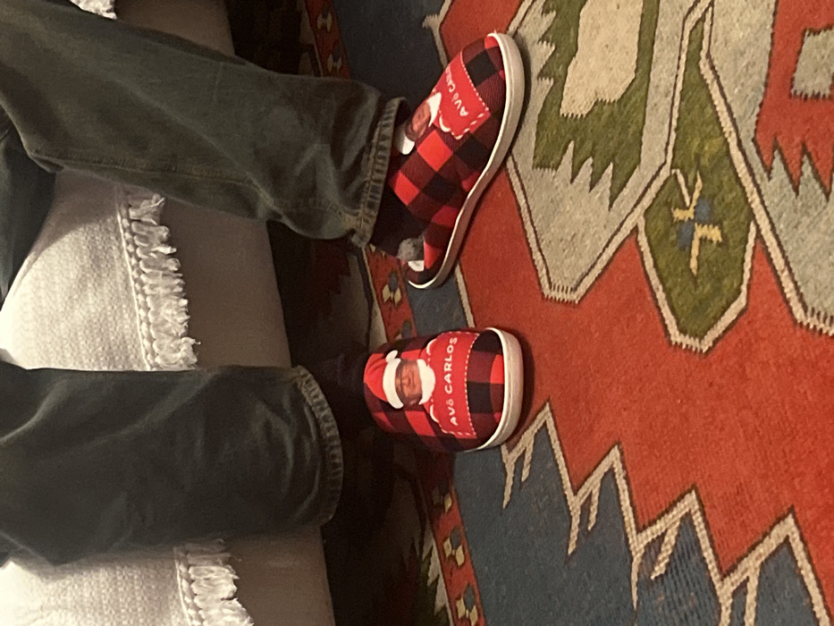 A person wears red and black plaid slip-on shoes with white soles. Each shoe features a picture of a person wearing a Santa hat and the name "AVO CARLOS" printed next to the picture. The person is wearing jeans and sitting on a white sofa or chair. The shoes rest on an area rug with a red, blue, green, and white pattern.