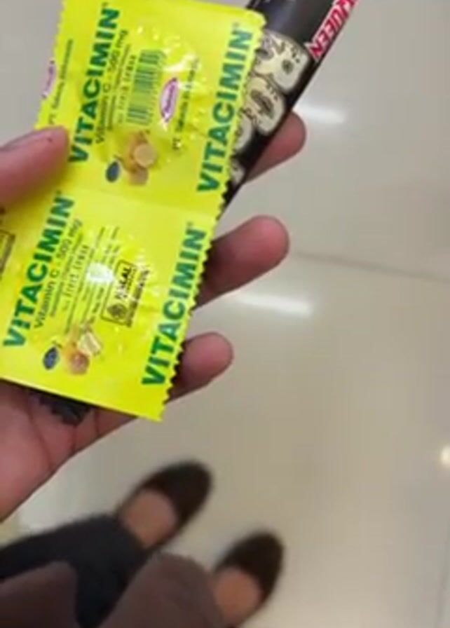 A person stands in a FamilyMart convenience store, holding two Vitamin C tablets and a chocolate bar in their hand