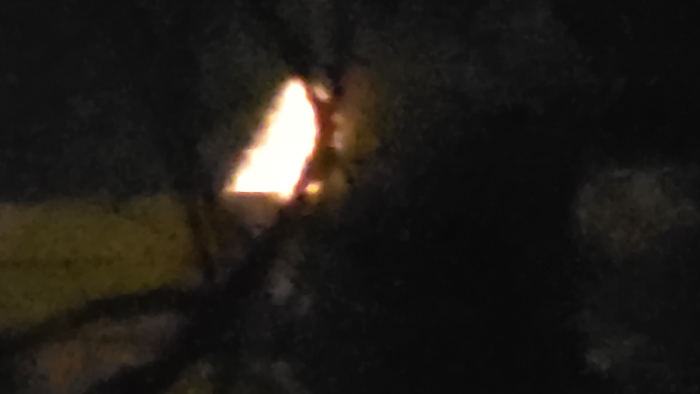 The image displays a dark, blurry, low-light scene, located in the city of Raanana, Israel. A prominent, intensely bright, irregularly shaped yellowish-orange light source occupies the lower-central portion of the frame, illuminating a limited area around it. The light appears to emanate from a ground-level or low-lying object. The surrounding environment is characterized by profound darkness, with indistinct, shadowy forms filling the majority of the background and foreground, suggesting an outdoor setting during nighttime. A vertical, faded yellow band or marking is faintly visible in the upper-left quadrant. No specific individuals, discernible actions, or other identifiable objects are present in the image due to the poor illumination and significant motion blur or focus issues.