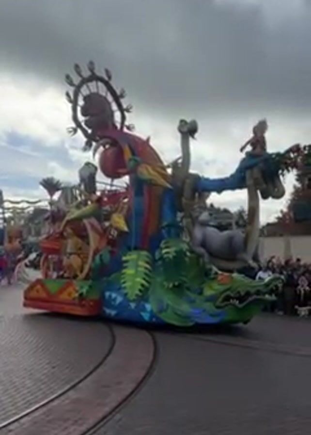 A slow-moving parade float at Disney World rolls by a line of people. The float is colorful and features a large green alligator at the bottom, a gray hippopotamus, a snake, and a figure in a blue outfit. On top of the float are various statues and props including a sun-like halo. The parade takes place on a gray paved road with embedded tracks. People line the sides of the road, watching the parade under a cloudy sky. A parade worker walks in front of the float.
