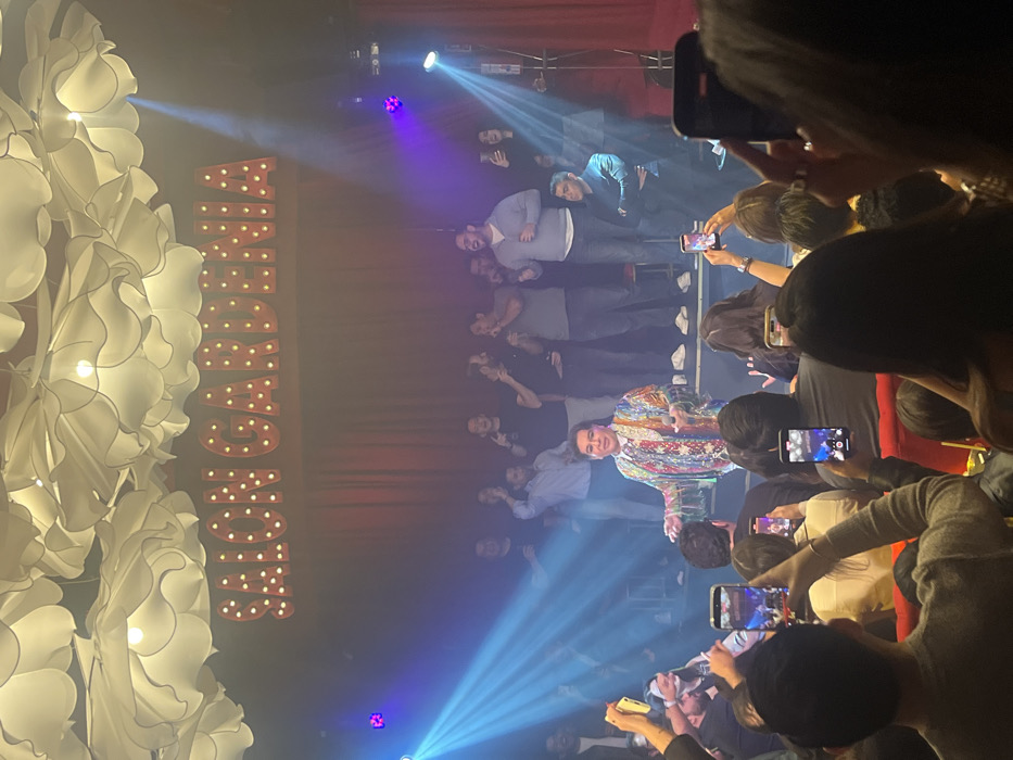 A performer wearing a colorful jacket stands on stage, addressing a crowd. Attendees hold up phones, recording the event. Behind the performer, several individuals are posing for the cameras. Stage lighting illuminates the scene with spotlights and colored lights. The background is decorated with the words "JACK GARDENIA" in large, illuminated letters and adorned with floral arrangements. The image is slightly tilted.