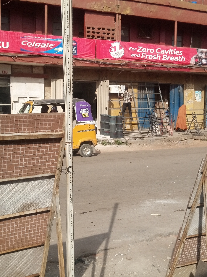 A street scene features a yellow auto rickshaw with a purple advertisement on top, parked near a building. A red banner promoting Colgate toothpaste spans the building's facade. In front of the building, a man climbs on a metallic structure while another person wearing an orange garment stands nearby. The foreground includes metal frames and a road.