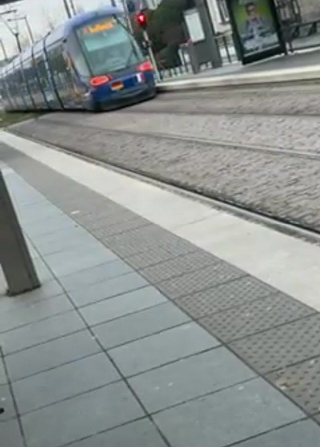 tram approaching and passing by a tram stop on a cloudy day