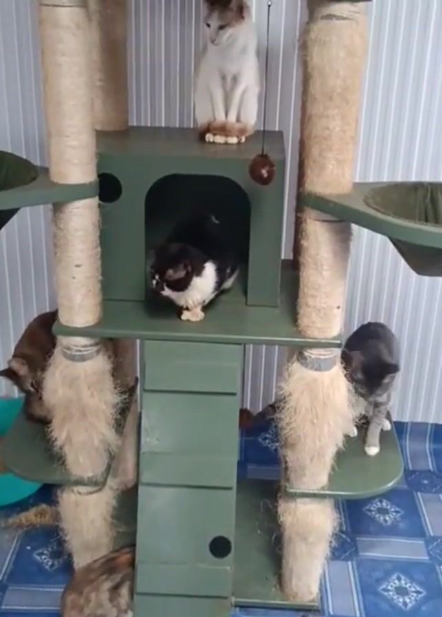 - "green, multi-level cat tree occupied by several cats" by FM-E8rQG2, licensed under CC BY 4.0