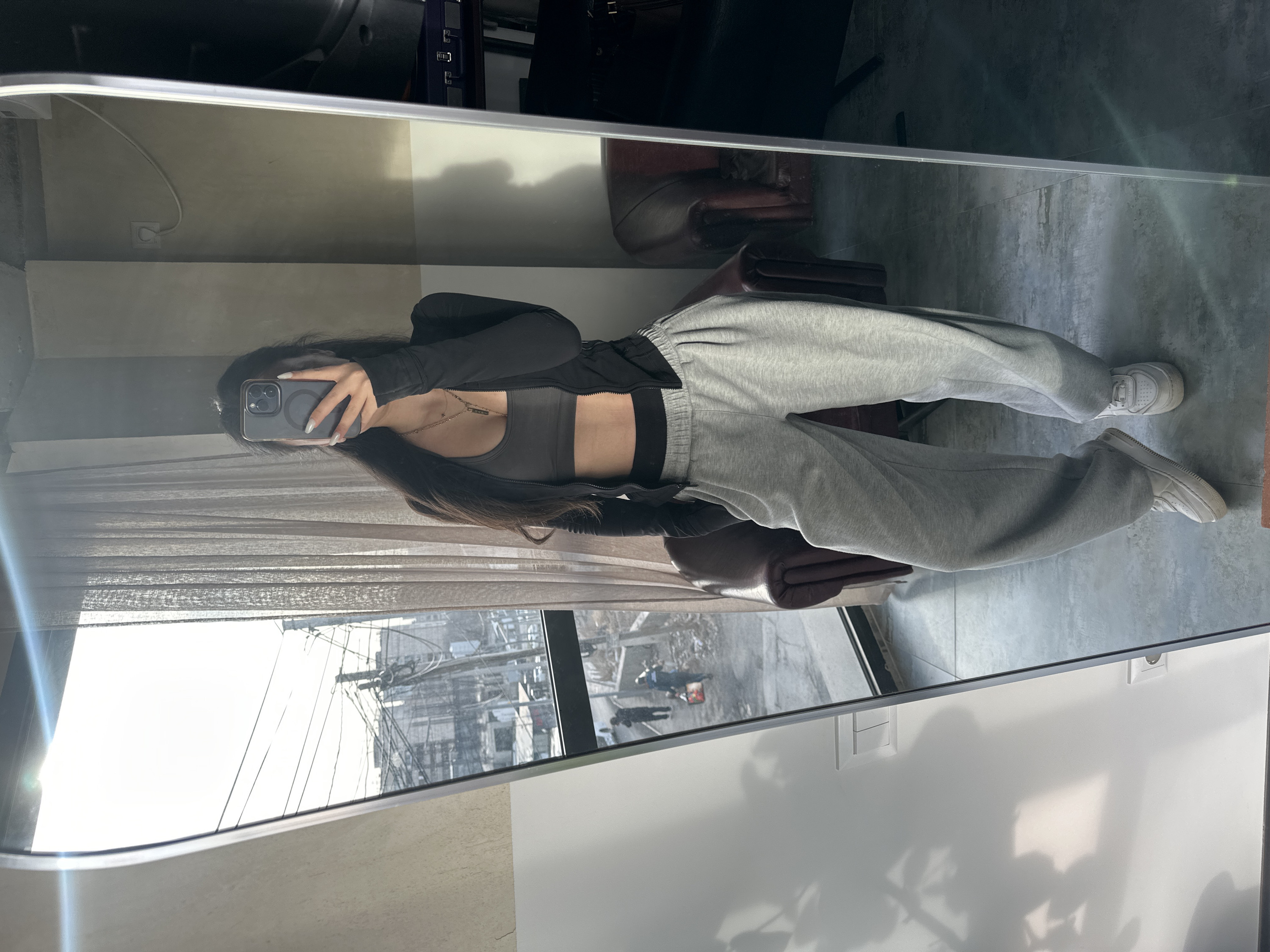 A female individual is depicted indoors, reflected in a full-length mirror, engaged in taking a self-portrait with a dark-colored smartphone that obscures her face. She has long, dark hair and is attired in a black long-sleeved zipped jacket, a dark grey sports bra exposing her midriff, light grey sweatpants, and white sneakers. Multiple layered necklaces are visible on her chest. The indoor environment features light grey walls and tiled flooring. To the left of the subject, a brown leather armchair is present, while a darker piece of furniture is partially visible to the right. A light switch with two horizontal toggles and an electrical outlet with a white cable plugged in are visible on the right wall. Natural illumination enters from a large window located behind the subject, partially covered by light-colored sheer curtains. Through the window, an urban landscape consistent with a street scene in the city of Zovuni, Armenia, is visible. This exterior view includes multi-story buildings, numerous overhead utility lines strung between poles, and a street where vehicles and several pedestrians are observed. One pedestrian is seen carrying a colorful bag. The bright lighting indicates a daytime setting.