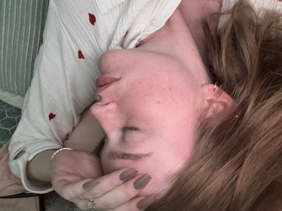 The image displays an individual, likely a young adult female, lying on a surface consistent with a bed or sofa, within an indoor environment located in Rosmalen, Netherlands. The subject is positioned in profile, facing left, with her eyes closed and lips slightly parted, indicating a state of rest or sleep. Her complexion presents with a reddish hue. Long, light brown hair is visible, spread across the surface around her head. Her left hand is placed on her forehead; the fingers exhibit long, coffin-shaped nails painted a matte taupe color. A ring with a clear stone is visible on the ring finger of the left hand, and a silver-colored bracelet with multiple small reflective elements encircles her left wrist. She is dressed in a white, long-sleeved garment, possibly a shirt, which features scattered small red heart-shaped motifs. The background is out of focus, revealing soft furnishings, including pillows, one with a geometric pattern and another with horizontal stripes, in muted shades of blue-green and grey.