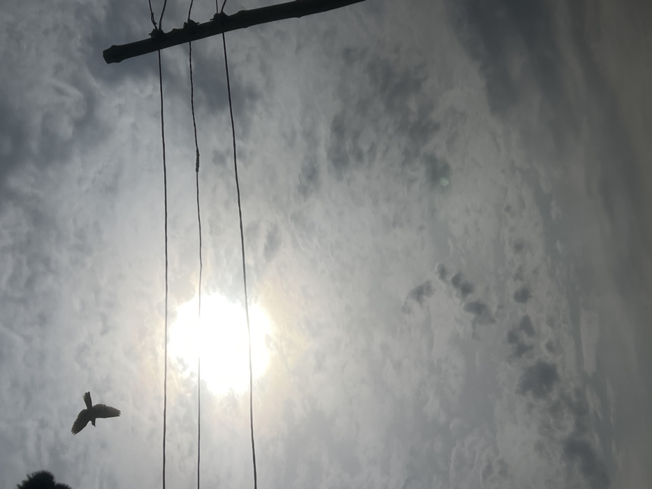The image depicts an outdoor scene in Bukuru, Nigeria, primarily focused on the sky and utility infrastructure. The sky is mostly overcast with numerous stratocumulus or altocumulus clouds displaying various shades of grey and white. A powerful, overexposed sun is prominently visible in the upper-left quadrant, creating a bright white glare and lens flare. A dark, silhouetted bird with outstretched wings is captured in flight in the upper-left section of the frame, positioned above the sun. Three dark, horizontal utility wires traverse the mid-section of the image, appearing taut and parallel. These wires are connected to and supported by a dark, vertical utility pole, likely constructed from wood, which occupies the entire right edge of the frame. A small, dark, indistinct object, possibly a tree or structure, is partially visible in the extreme upper-left corner. No people or overt interactions are present.