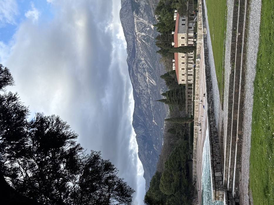 A scenic landscape shot with a large mountain backdrop under a cloudy sky. A grand building with a red roofline is surrounded by trees. A stone-lined waterfront is visible, with waves coming in on the shore. Grass and stone steps lead down to the water. Dark tree branches are silhouetted in the foreground.