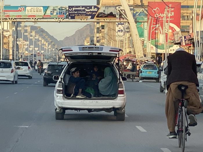 This image depicts a daytime urban street scene in Kandahar, Afghanistan, characterized by moderate vehicular and pedestrian traffic