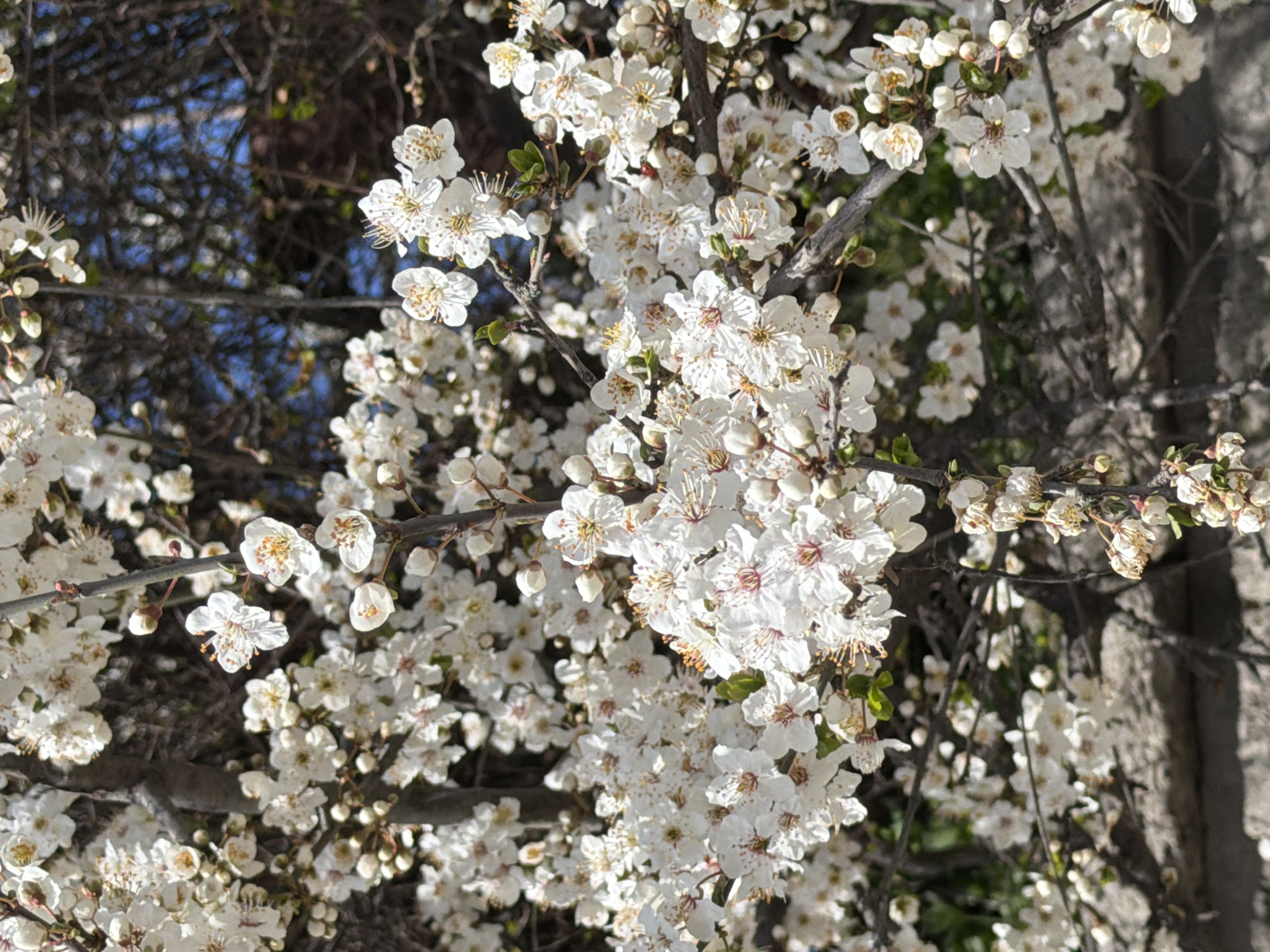 The image displays a detailed, close-up view of a flowering deciduous tree in Varna, Bulgaria. The scene is dominated by numerous clusters of small, white, five-petaled blossoms. Each bloom exhibits visible yellow-orange stamens, with some flowers also featuring faint reddish hues at their centers. A significant number of unopened white flower buds are interspersed among the fully opened blossoms. The flowers are densely arranged on dark, gnarled tree branches, which show a few emergent small green leaves. In the upper background, intermittent patches of clear blue sky are visible through the foliage. The lower background features a blurred, textured gray surface, consistent with a stone wall or similar structure, partially obscured by the tree branches. No human individuals, animals, or artificial objects are present in the depicted environment.
