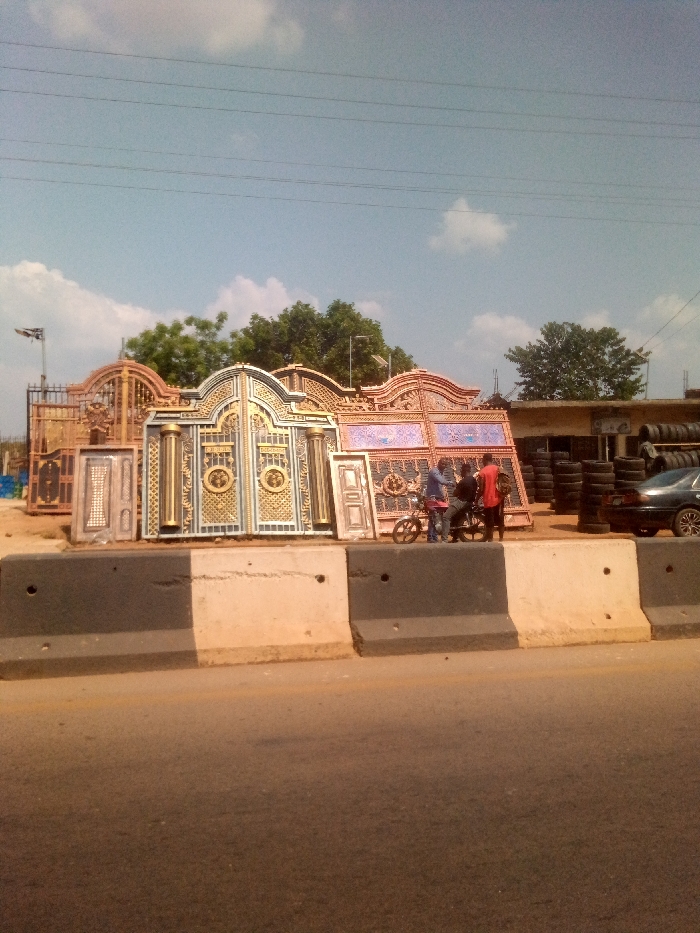 The scene depicts a street-side commercial area in Agbani, Nigeria. In the foreground, a multi-lane asphalt road is separated from the adjacent commercial establishments by a line of concrete jersey barriers, painted alternately black and off-white/beige. Beyond the barriers, on an unpaved dirt surface, multiple large, ornate metal gates and doors are displayed for sale. These gates exhibit intricate designs, featuring various colors including gold, blue, pink, and black. Some gates have arched tops, while others are rectangular. Notable examples include a prominent blue and gold double gate with circular motifs and a pink/red and gold gate with geometric patterns. Smaller single doors are also visible amongst the larger gates. To the right of the gate display, three adult males are visible. One individual, wearing a blue long-sleeved shirt and trousers, is standing near a black motorcycle. Another individual, wearing a red short-sleeved shirt and dark trousers, stands to his right, facing the first man. A third individual, wearing a dark shirt and trousers, is positioned between the first two, appearing to engage in conversation. The motorcycle is dark-colored with spoked wheels. Further to the right, a tire shop operates, with numerous stacks of vehicle tires piled high against a building structure. A dark-colored sedan is partially visible parked near the tire piles. In the background, mature green trees are present, along with utility poles and power lines spanning across the clear, light blue sky which features scattered white clouds. A street light is also visible on the left side of the image.