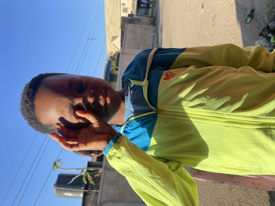 A young child with dark skin and short, dark hair stands outdoors in Jos, Nigeria, facing slightly left of the camera under bright sunlight