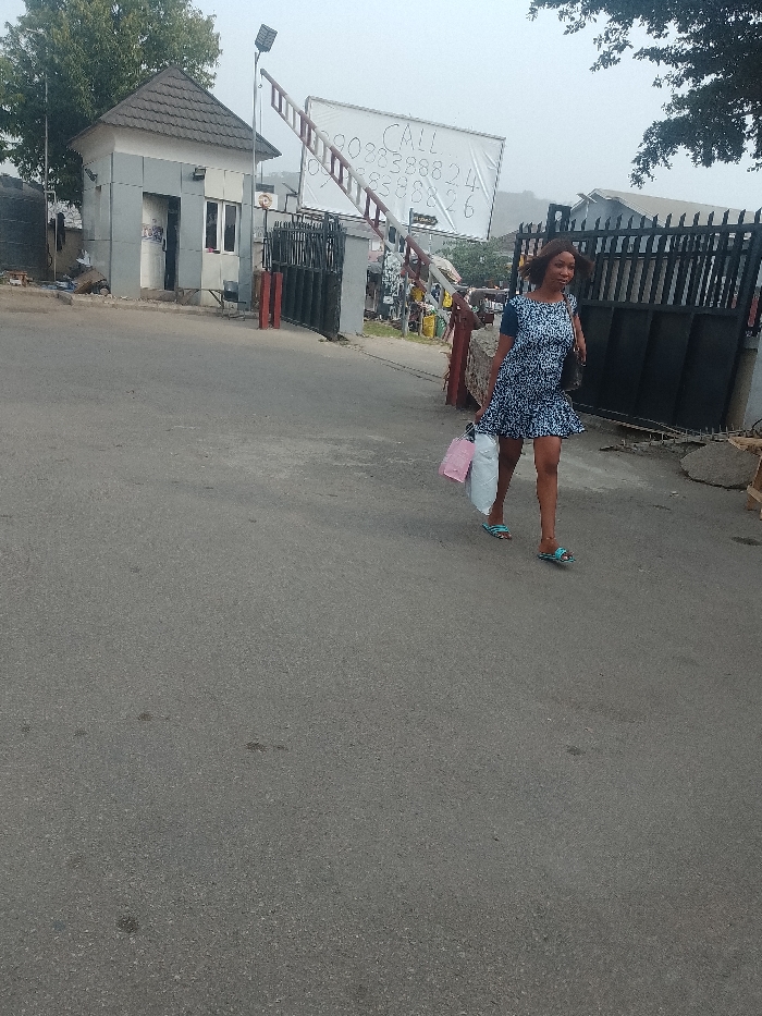 The image depicts an outdoor scene in Gwarinpa, Nigeria, focusing on a road leading to a gated access point