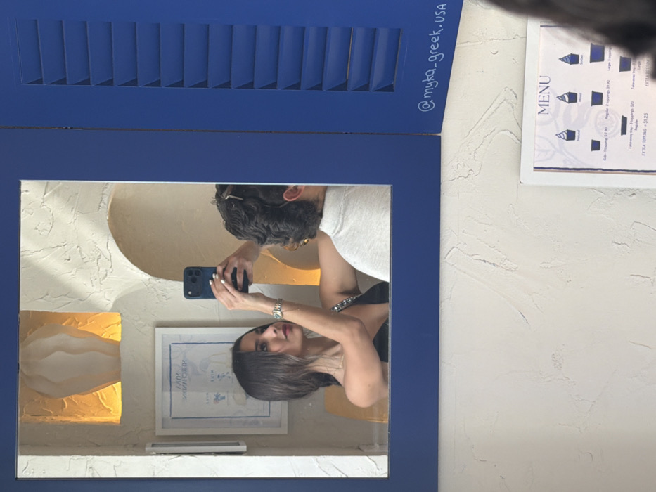 An indoor scene within Myka Greek, Miami Beach, United States of America, is captured via a mirror reflection. A female subject, with long dark hair and wearing a black one-shoulder top featuring a metallic-studded strap, is reflected taking a selfie with a dark-colored smartphone held in her right hand. She wears a silver-toned watch on her left wrist. To her right in the reflection, the back of a second individual, a male with dark, curly hair and wearing a light-colored polo shirt, is partially visible. The reflected background consists of a textured, light-colored wall with an illuminated rectangular niche containing a white, organic-shaped sculpture. Below this, a framed document with blue text and illustrations hangs. An arched architectural detail is also visible on the textured wall. The mirror itself is framed in a thick, matte blue. To the right of the main mirror, a separate blue decorative panel, designed to resemble a louvered window shutter, displays the white script "@myka_greek.USA". Below this panel, a white menu board is partially visible, listing "MENU" at the top and detailing soft-serve dessert options with prices, such as "Kids 1 topping $7.90" and "EXTRA TOPPING +$1.25".