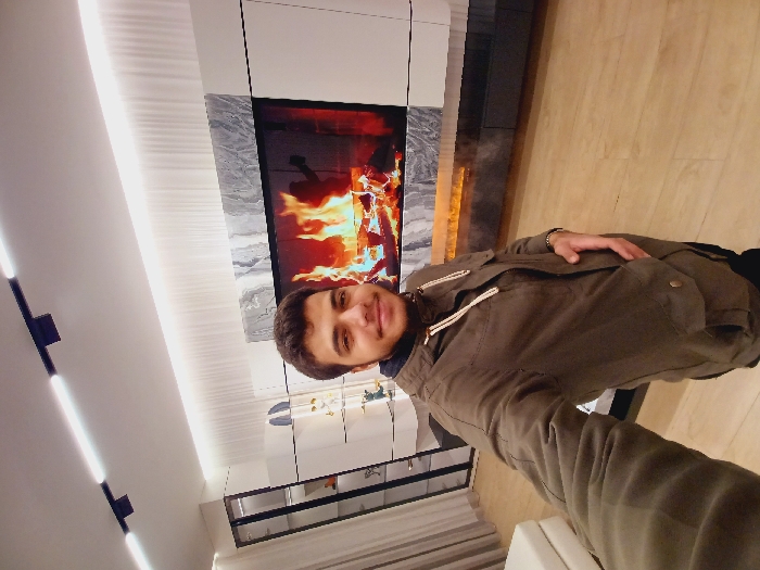 A man in a green jacket stands in a modern living room. Behind him, a sleek fireplace with a vivid display of simulated flames adds warmth to the scene. The room is illuminated by contemporary linear lighting fixtures on the ceiling. Below the fireplace is a modern display case, contributing to the overall stylish ambiance. The floor has light-colored wooden planks.