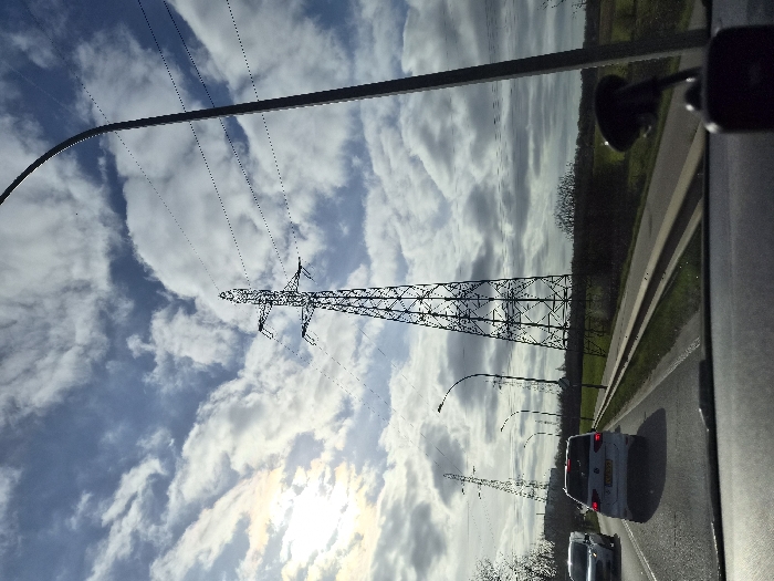 The image depicts a daytime scene on a road in Sanem, Luxembourg, captured from within a vehicle looking forward through the windshield. A prominent lattice steel electrical transmission tower stands slightly right of center, extending power lines horizontally across a partially cloudy sky with bright sunlight visible on the far left. A second, smaller transmission tower is visible in the distance on the left side of the road. The asphalt road features a median strip. Directly ahead in the same lane is a white Volkswagen vehicle bearing a Luxembourgish license plate, partially visible as "KS 7047". Further ahead in the left lane, a white van is visible. Multiple streetlights line the road, with one tall, curved streetlight visible on the far right. The foreground shows a dark dashboard and a black suction cup mount on the right. The environment surrounding the road consists of green fields and scattered vegetation. No individuals are distinctly visible.