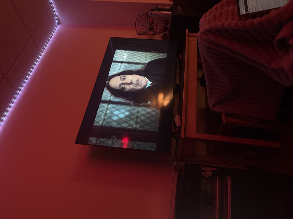 A television screen shows Severus Snape with long black hair against a backdrop of bars. The screen is positioned on a light wood stand. A plush throw is draped on a nearby chair. A string of lights illuminates the ceiling edge of a red-toned room. A wire basket sits on a dark surface above the TV. The overall lighting appears dim.