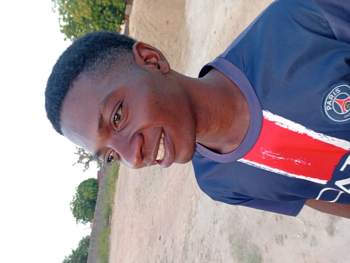 A young, dark-skinned man with short, dark hair smiles. He wears a dark blue Paris Saint-Germain jersey with white and red stripes. The background features a sandy area, sparse vegetation, and a few trees under a bright sky. The image appears to be taken outdoors during the daytime. The man is angled slightly to the side, and his eyes are focused on the viewer.