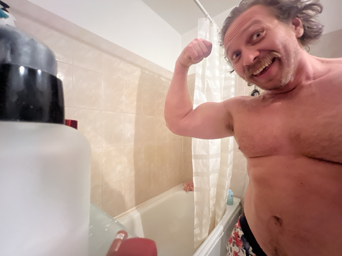 In a bathroom, a shirtless man with a mustache flexes his bicep. He is smiling. He is standing near a bathtub with a white shower curtain. In the foreground, there is a blurred image of a white bottle with a black cap. Beige tiles line the wall above the tub.