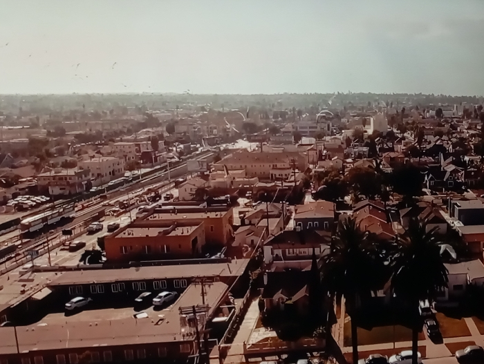 A city view under a hazy sky shows low-rise buildings interspersed with trees and residential homes. A railway track with parked trains runs through the urban landscape. Streets are lined with cars, suggesting moderate traffic. Palm trees stand tall in the foreground. The city stretches into the distance, blending into the horizon under the overcast sky.