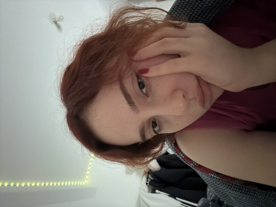 The image displays a young adult female with reddish-brown, wavy hair and fair skin, photographed in a close-up, head-and-shoulders view