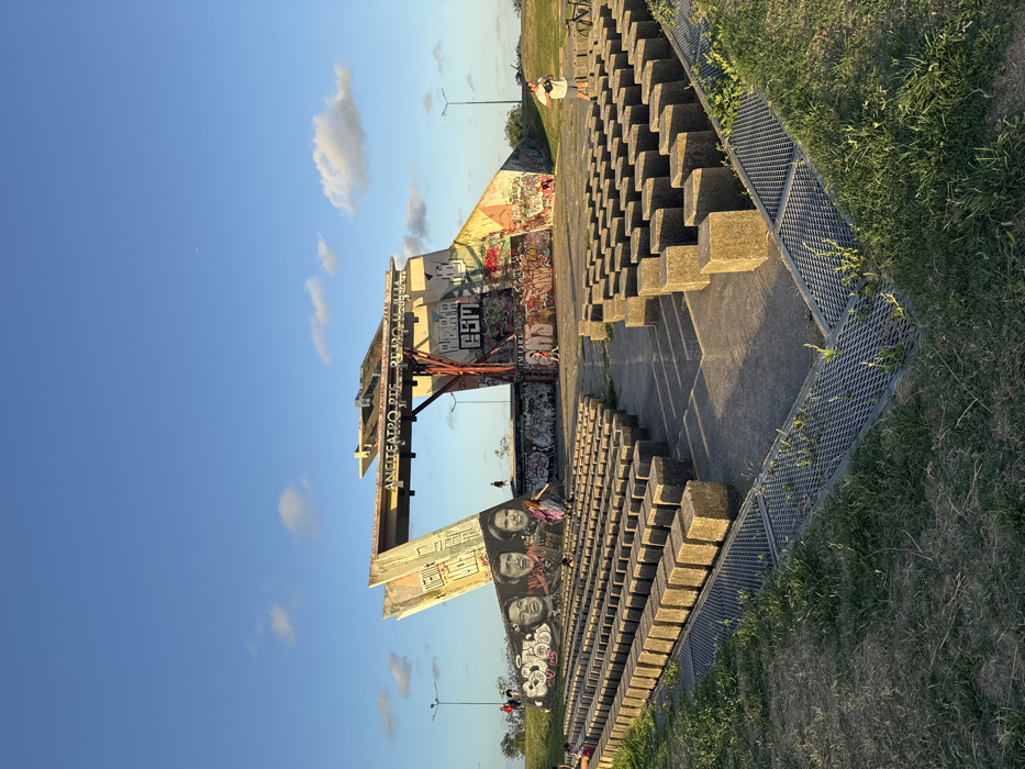 - "An outdoor amphitheater, identified as "ANFITEATRO RÍO DE LA PLATA," is depicted under a clear blue sky with scattered cumulus clouds, illuminated by late afternoon sunlight" by FM-AzJ7y1, licensed under CC BY 4.0
