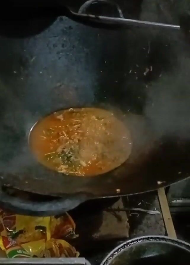 A top-down shot shows noodles and greens cooking in a sauce within a large wok. The wok is black and is positioned over a burner. Steam rises from the wok. Packages of instant noodles are visible on the left. A metal pot also sits below the wok.