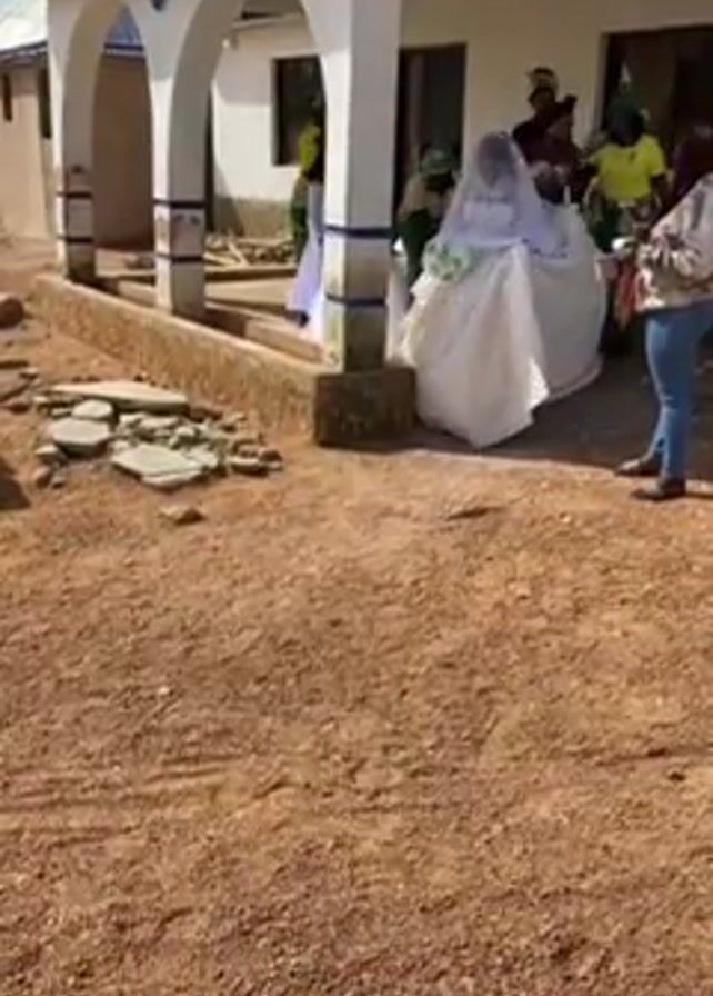 A bride in a white wedding dress walks slowly away from a white building with a blue roofline. Several people, including women dressed in green, walk behind the bride. A woman in jeans stands to the right of the bride and films the scene. The ground is red and rocky.