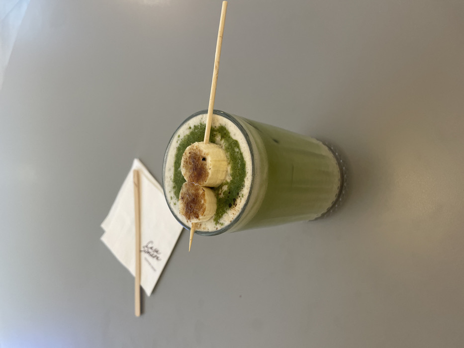 - "A tall glass of matcha latte, topped with two caramelized banana slices skewered with a wooden stick, lies horizontally on a gray surface" by FM-nvaX33, licensed under CC BY 4.0