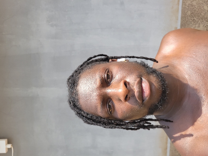 This image is a close-up portrait of an African male subject taken outdoors in Markurdi, Nigeria. The individual, appearing to be in his 20s or 30s, has a dark complexion, black dreadlocks, and a full dark beard. His upper torso is bare, with his skin appearing moist or perspiring. A white earbud is visible in his right ear. He looks directly forward into the camera. The background consists of a plain, light gray textured concrete or stucco wall. In the upper left quadrant of the background, a white rectangular electrical fixture is mounted on the wall. The scene is brightly illuminated, with strong natural light suggesting direct sunlight.