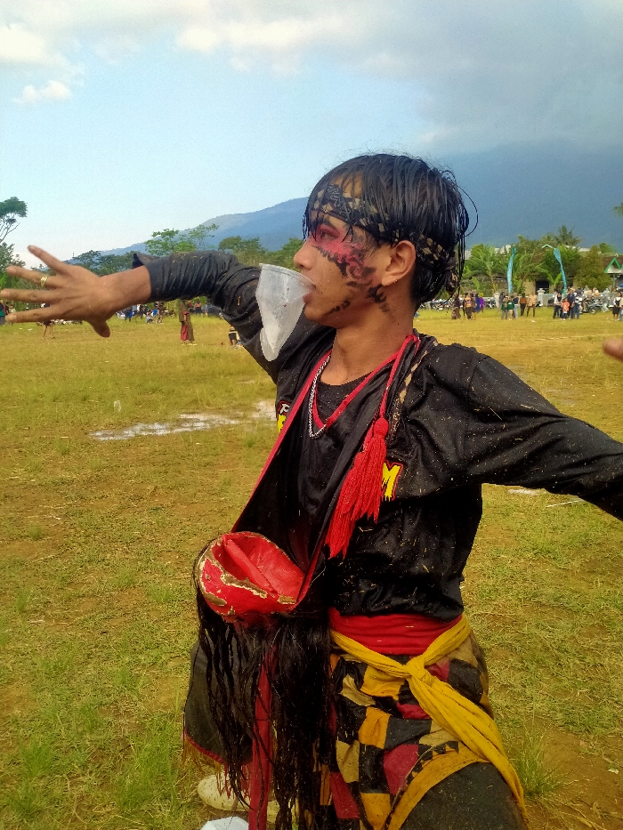 A young male, likely a performer, is captured in profile on an open, muddy grassy field in Sidomukti, Indonesia