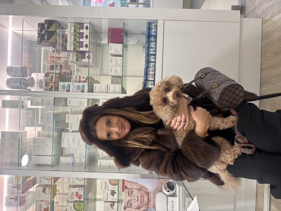 An adult female sits within a brightly lit health and beauty store, likely a pharmacy or parapharmacy, in Torres Vedras, Portugal. She is positioned against a backdrop of glass display shelves filled with various packaged wellness, skincare, and supplement products. The woman, who has long brown hair, is smiling directly at the viewer. She wears a brown fur coat with a hood and black trousers. In her arms, she cradles a small, light brown, curly-haired dog, possibly a poodle, which is looking slightly to the right. The dog has a plaid-patterned collar and leash. A dark brown Louis Vuitton Papillon-style handbag with a checkered pattern rests on the woman's lap/leg. Her left wrist displays a silver-cased watch and two gold-colored bracelets, with a ring on her left ring finger. To the far left, a white counter holds a white facial aesthetic device and a poster featuring a woman's face and the text "MEGAN" and "KYNDOR," advertising a "3D experience." The shelves in the background contain products labeled in Portuguese and English, including "Depur," "Slim," "Vital," "SkinTeen," "Alcachofra," and "Sopa light Tomate." The store environment is clean, modern, and well-organized, with white fixtures and bright overhead lighting.