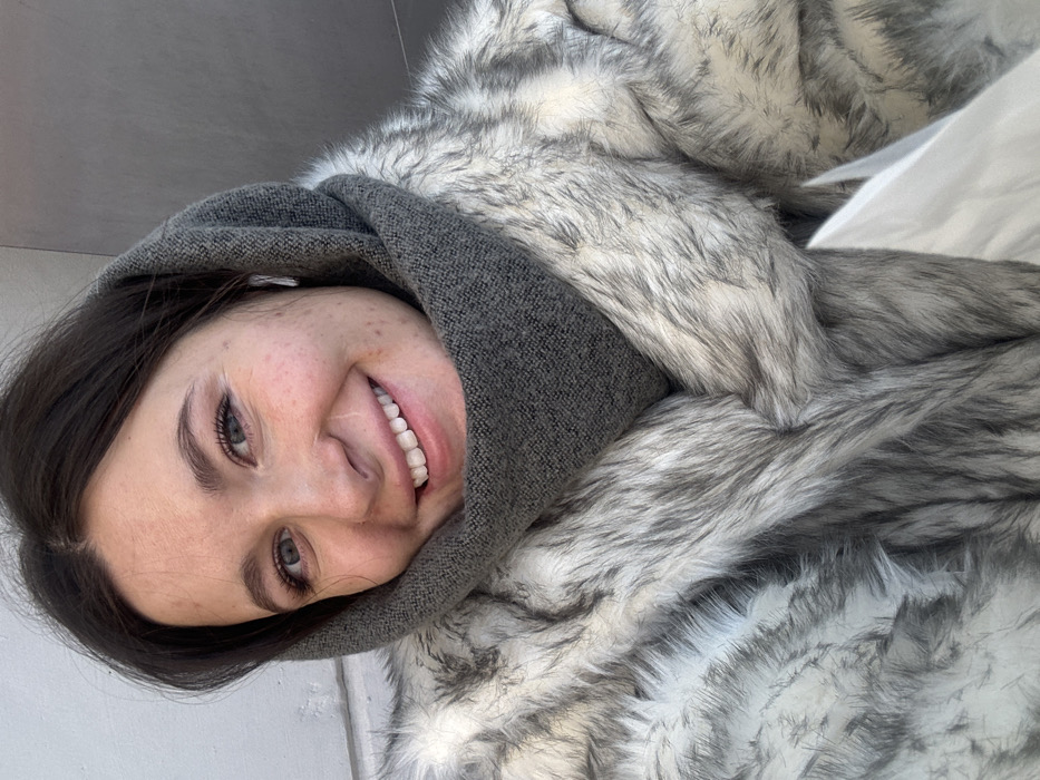 The image displays a close-up portrait of a young adult female, situated in Moscow, Russia. The subject is smiling and looking directly into the camera. She has dark brown hair and light-colored eyes, with minor facial blemishes visible. She is wearing a dark grey knitted hood or cowl that covers her head and neck, and a multi-toned faux fur coat with white and grey strands. A single white wireless earbud is present in her right ear. The background is out of focus, featuring a light-colored vertical surface on the left and a darker, uniform grey surface on the right.