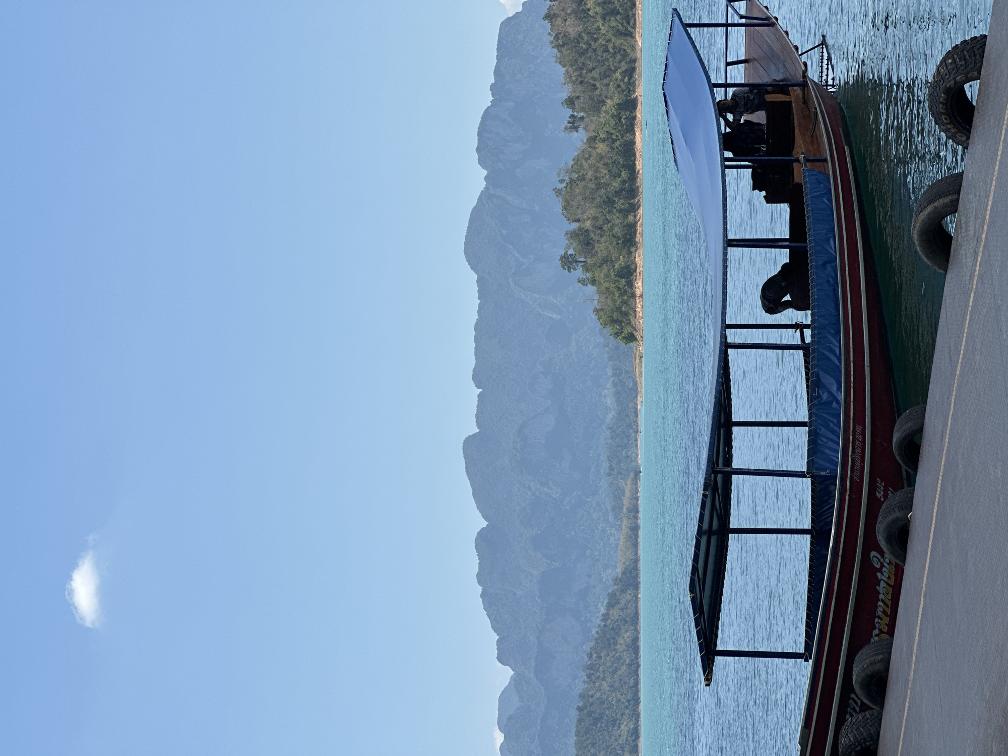 longtail boat docked at a concrete pier. The boat has a blue awning and tires along its side to protect it from rubbing against the pier. In the background, there is a lake and mountains. The sky is blue with a small cloud. The location is Ban Ta Khun, Thailand.