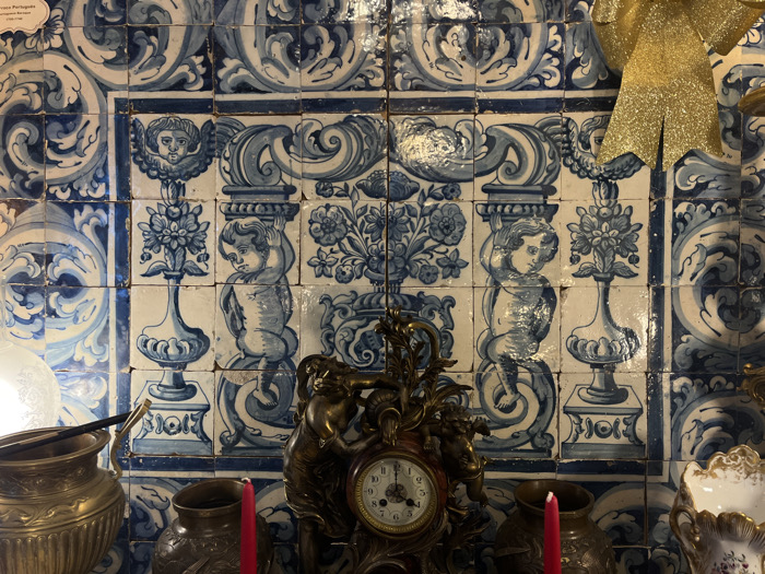 The scene depicts an interior setting within Sintra (Santa Maria e São Miguel, São Martinho e São Pedro de Penaferrim), Portugal. The background is dominated by a wall entirely covered in traditional Portuguese blue and white *azulejo* tiles. These tiles feature intricate Baroque-style patterns, including large decorative scrolls, floral motifs, and figurative elements. Two prominent cherubic figures are depicted: one winged bust in the upper-left section of the central tiled panel, and a full-body cherub supporting an architectural element in the lower-right section of the central panel. Each cherub is flanked by vase-like structures holding flowers. A partial white label with black text is visible on a tile in the upper-left quadrant. In the foreground, a collection of antique or decorative objects is displayed on an unseen surface. From left to right: 1. A large, ornate brass or bronze urn with a ribbed body and decorative bands. A slender, dark object is vertically positioned within its opening. 2. Behind the urn, a translucent, possibly frosted glass lampshade emits a soft, warm light. 3. Centrally positioned is a substantial antique mantel clock with a dark, possibly bronze, ornate casing. The casing includes sculptural figures, likely cherubs or classical nymphs, surrounding a circular clock face with visible hands and numerals. 4. To the left of the clock, a single, unlit red taper candle stands upright in a dark, metallic vase or holder. 5. To the right of the clock, another similar dark, metallic vase or holder is present. 6. Partially visible on the far right is a decorative porcelain or ceramic dish or bowl, white with prominent gold scalloped edges and accents. The scene is illuminated by ambient light and the glowing lampshade, creating soft shadows and highlighting the textures and details of the objects and tiles. The overall impression is that of a curated display within a historical or traditionally decorated space.