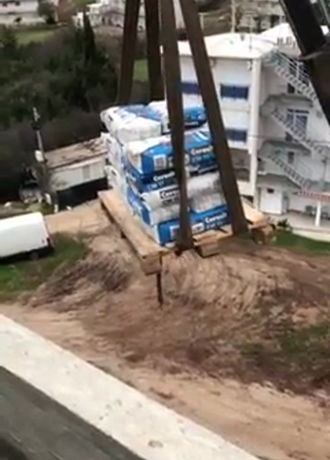 construction site. A crane is lifting a stack of blue and white bags, possibly containing cement or similar building material. The bags are stacked on a wooden pallet, and the crane uses a four-point sling to lift the load. The site is partially cleared, with visible dirt and tire tracks. In the background, there are several buildings, including a white multi-story building with a staircase and a white van parked nearby. The camera is positioned at a high vantage point, likely on another building under construction.