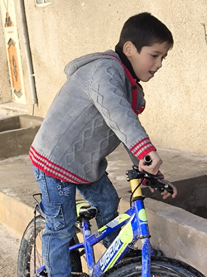 A young male child, estimated to be between 5-8 years old, is depicted outdoors in Jirud, Syria, positioned on a blue bicycle