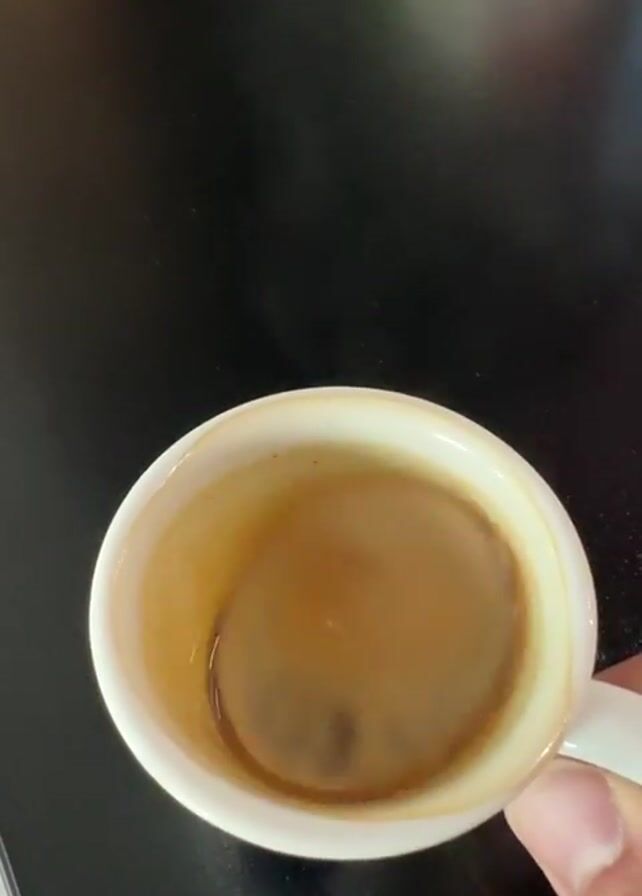 A close-up shot from above shows a white mug on a black surface. The mug contains a small amount of light brown liquid, possibly coffee or tea. A hand is partially visible, holding the mug's handle. The background is blurry and indistinct.