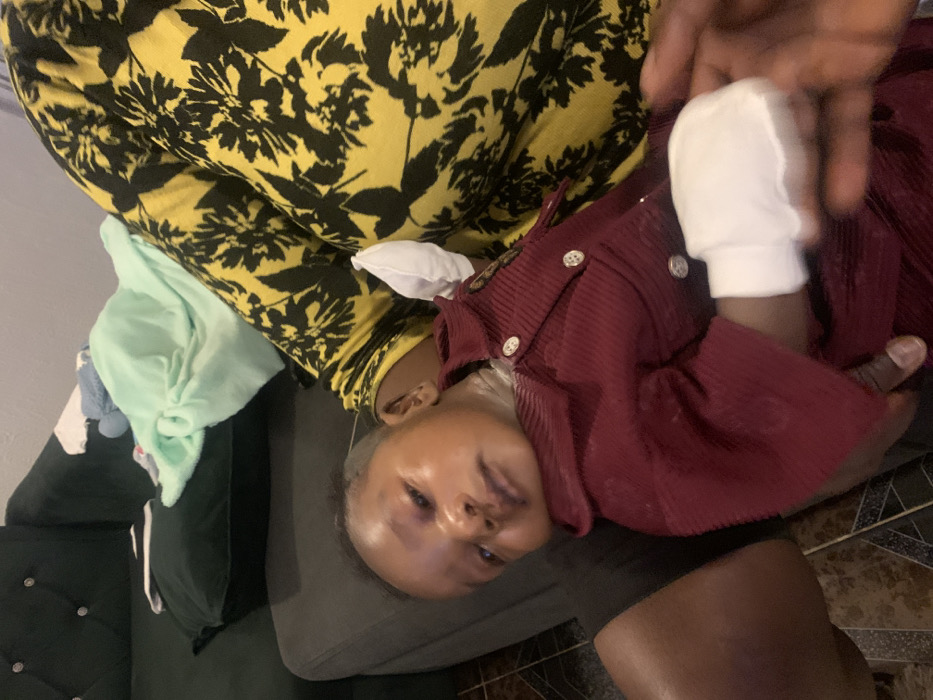 The image depicts an indoor scene in the city of Unknown, Unknown. An adult, wearing a yellow garment with a black floral pattern, is seated on a dark grey sofa, supporting an infant on their lap. The infant, with dark skin and short dark hair, is dressed in a dark red, ribbed, collared top with light-colored buttons. The infant's left hand is covered by a white mitten, which is gently held by a dark-skinned adult hand. The infant is observed looking towards the viewer with eyes partially open. In the background, a dark green upholstered sofa with decorative buttons is visible, upon which a light green blanket and other light-colored fabrics are resting. The floor in the lower left foreground is tiled with a dark, patterned design.