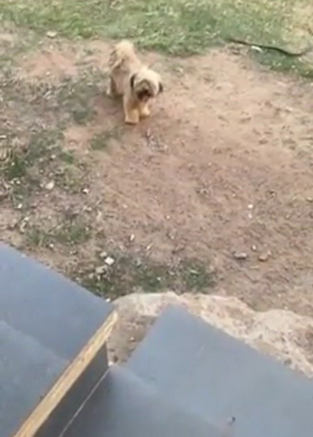 - "From a static, medium shot, a small, brown, long-haired dog stands on a patch of dirt and sparse grass, surrounded by slightly more green grass" by FM-0Er672, licensed under CC BY 4.0