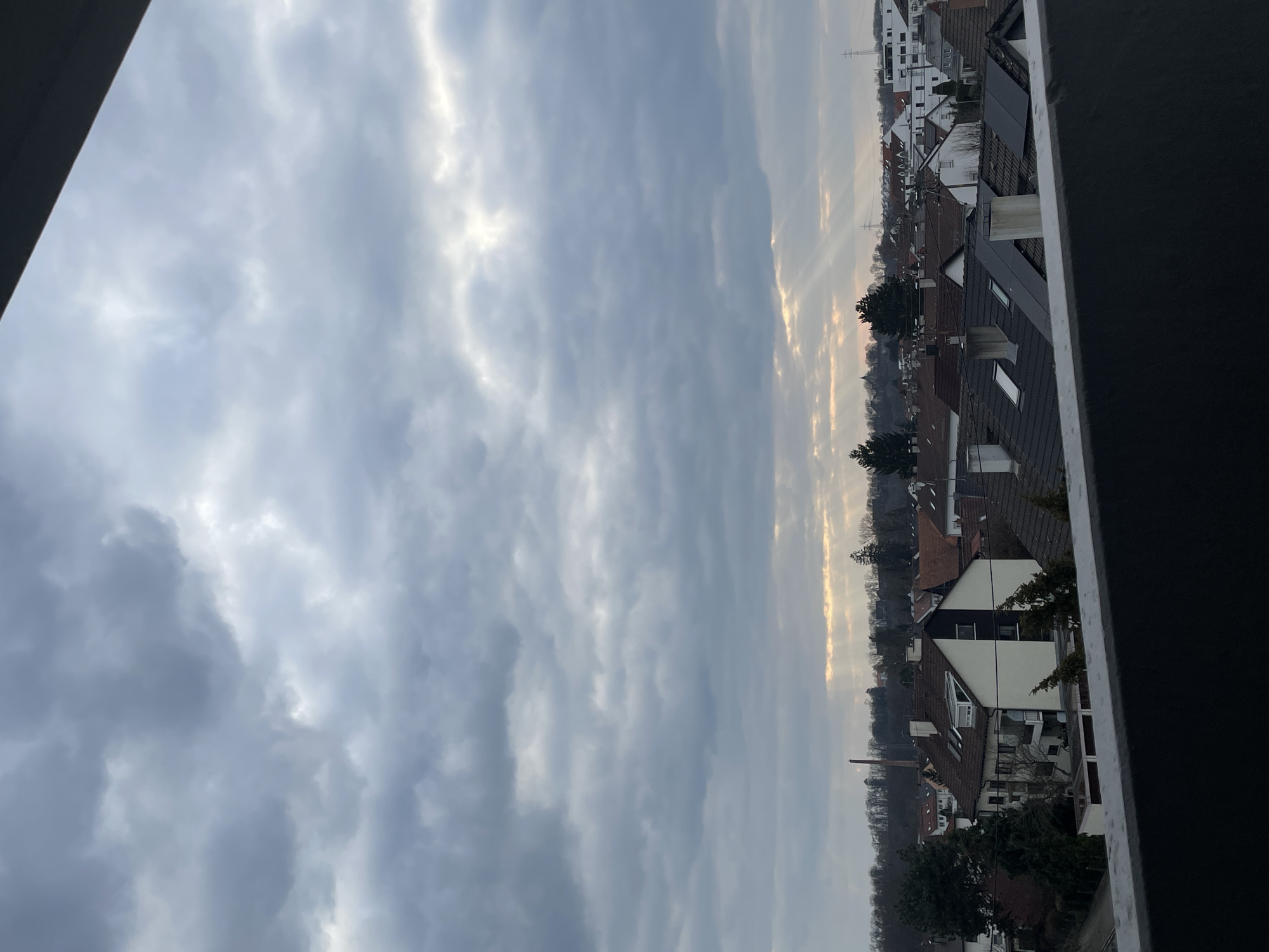 The image displays an elevated panoramic view of a residential district in Senden, Germany, observed under a predominantly cloudy sky. A dark, horizontal structure, likely a balcony railing, occupies the bottom segment of the frame. The sky is largely overcast with grey clouds, though distinct crepuscular rays of sunlight are visible penetrating the cloud cover in the mid-right and lower-central areas. The urban landscape below consists of numerous residential buildings, characterized by dark tiled roofs, some equipped with skylights and chimneys. Multiple roofs in the mid-right section feature arrays of dark rectangular solar panels. A prominent multi-story building in the mid-left exhibits white walls with a dark vertical accent and balconies. Deciduous trees, largely devoid of foliage, are interspersed throughout the urban fabric and form a dense tree line along the distant horizon. Above the distant tree line, a tall, slender brick chimney is visible on the left side, and a dark, pointed spire is discernible closer to the center. Two lattice-structure power line towers are present on the far right, rising above the horizon. No individuals are visible, and no specific actions or interactions are depicted within the scene.