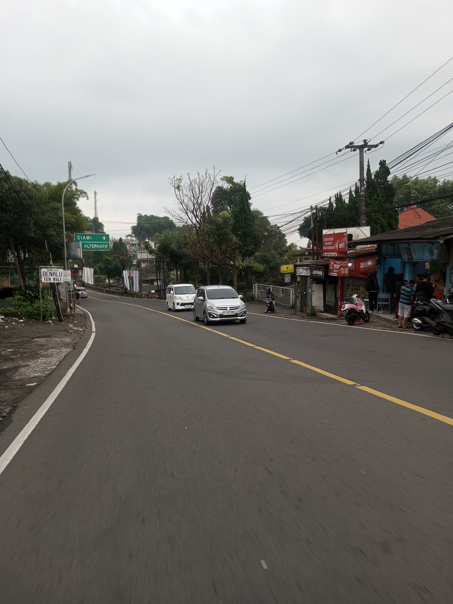 The image depicts a street scene in an unidentified city, likely in Southeast Asia, characterized by a road with a yellow centerline and white edge line. On the left side of the road, there is a road sign indicating directions to "CIAWI" and "ALTERNATIF," as well as another sign with the text "BENALU TEA ASLI." A silver car is driving on the road, followed by a white van. On the right side of the road, there is a row of small businesses or shops. People are gathered outside one of these establishments, some are standing while others are sitting. Several motorcycles are parked nearby. Overhead, there are electrical wires running along utility poles. The sky is overcast, suggesting a cloudy day.