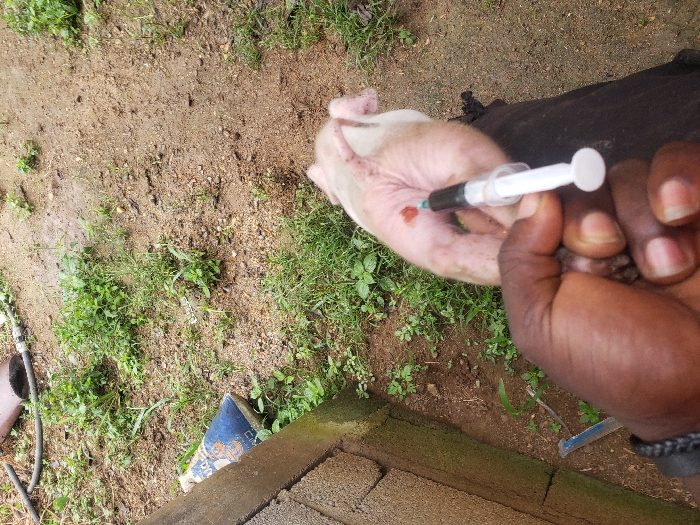 - "The image captures a close-up, top-down view of a small, pale-pink piglet being injected by a dark-skinned individual in Okola, Cameroon" by FM-Kpr5g2, licensed under CC BY 4.0