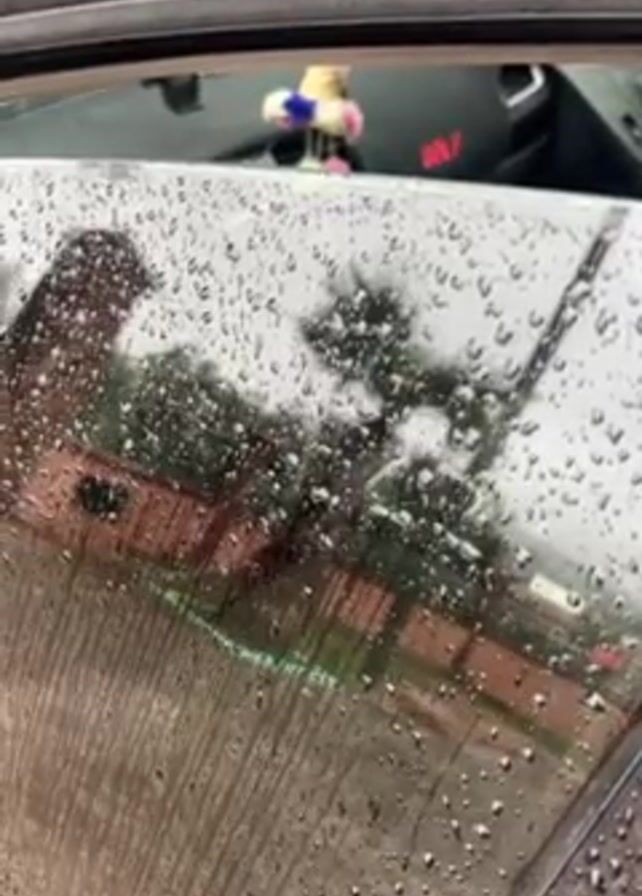 The camera is positioned outside a parked car during rainy weather