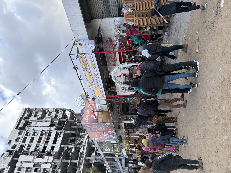 This image captures an urban street scene in Gaza City, Palestinian Territory, characterized by significant structural damage juxtaposed with active commerce